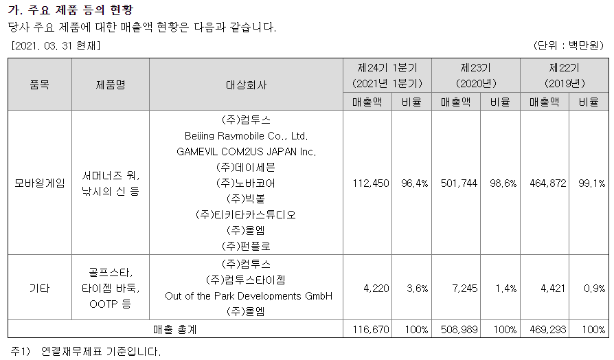 실제로 매출 비중을 보면 모바일 게임의 매출 비중이 2019년 기준 99.1%인 것을 볼 수 있습니다.