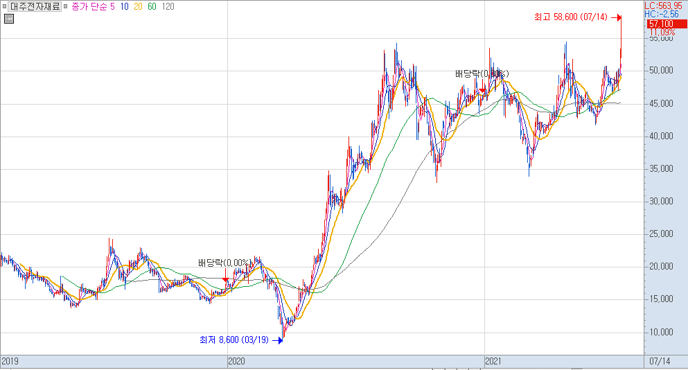 대주전자재료의 경우 경쟁사의 5% 보다 더 높은 15% 까지 높인 것으로 알려져 기술적인 매력도도 높아 보입니다.