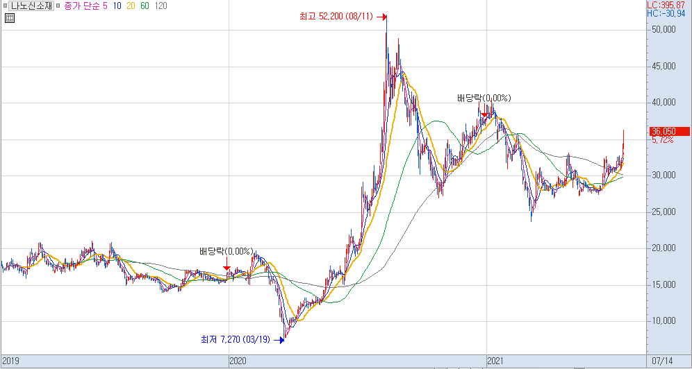 주가의 경우 20년 하반기에 급등한 이후 큰 복으로 횡보해 오고 있다가 오늘 급등이 나와 주었습니다.