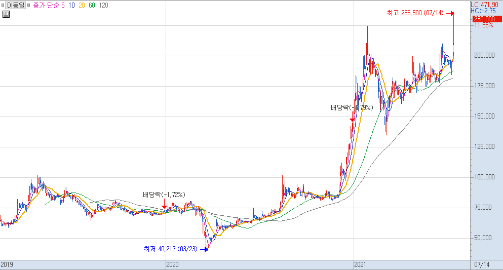 DI동일의 주가를 보시면 대주전자재료와 비슷하게 급등 후 횡보하는 모습을 보실 수 있습니다.