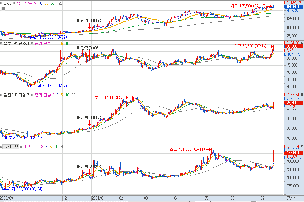SKC, 솔루스첨단소재,일진머티리얼즈, 고려아연 등의 관련업체가 있는데요,