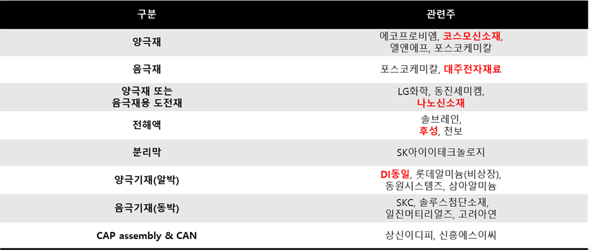 위에서 말씀드린 2차전지 구성요소별 대표적인 종목은 아래 표와 같구요,