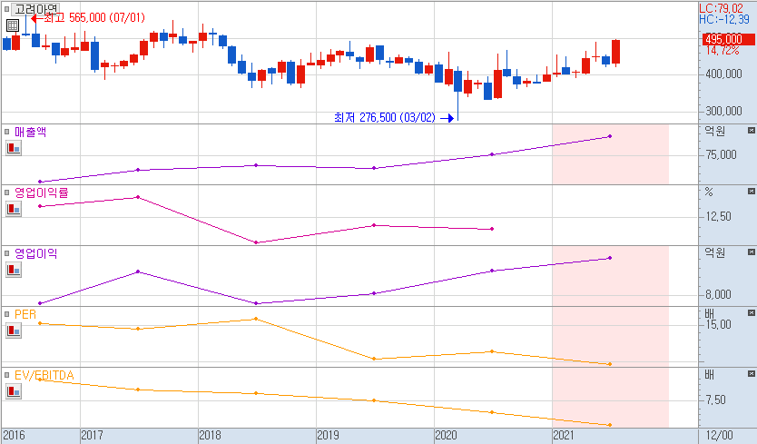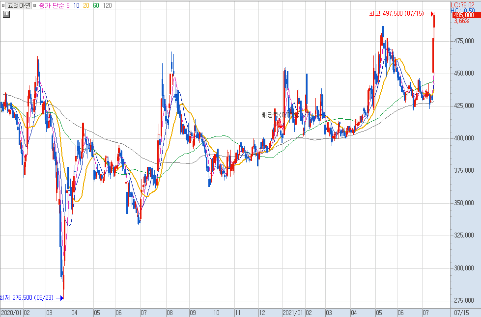 위 사진에서 보시는 것 처럼, 고려아연의 주가는 5년동안 큰 변화 없이 조금씩 우하향 하는 모습을 보이다,