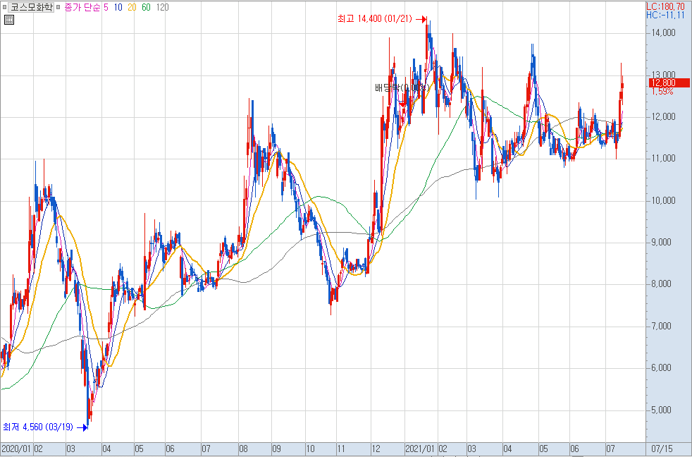최근 2차전지 관련 동박 사업에 진출, 그리고 전구체 사업에도 진출하면서 그만큼의 프리미엄을 받기 시작한 것으로 보여집니다.