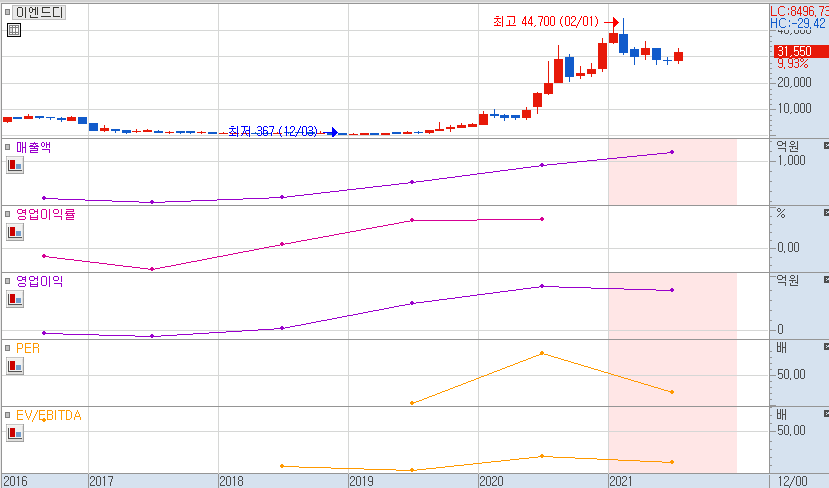 이엔드디의 연도별 매출액, 영업이익률 및 영업이익 등은 위 그래프와 같습니다.