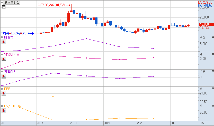 위 사진에서 보시는 것 처럼, 코스모화학의 주가는 2018년 초 최고점 이후 크게 하락하여 바닥을 다지고 있는데요,