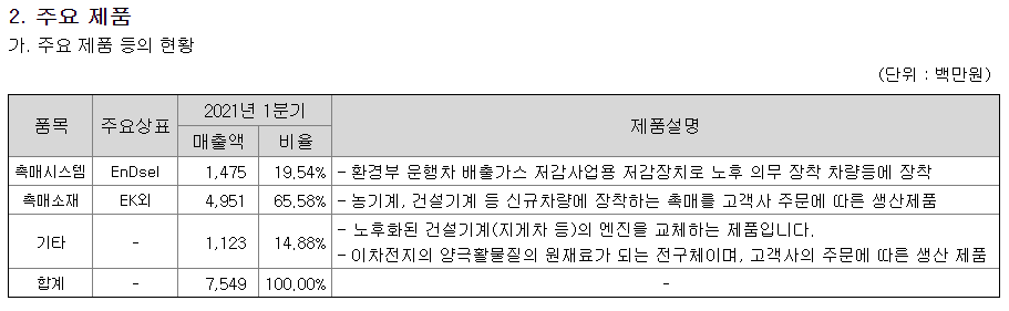 즉, 촉매시스템을 통한 자동차, 선박, 가전 등의 배출가스 및 배기가스를 저감시키는 장치가 주 사업입니다.