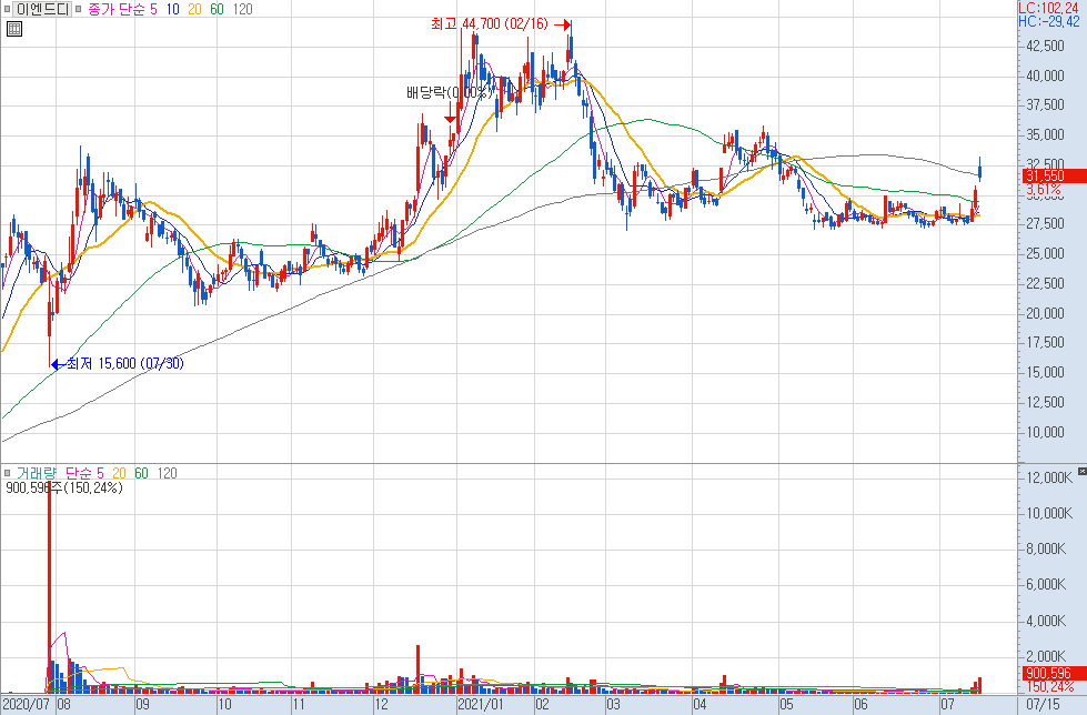 이엔드디의 경우 20년 7월 20일 상장한 업체로, 그 이전 주가는 크게 의미가 없습니다.