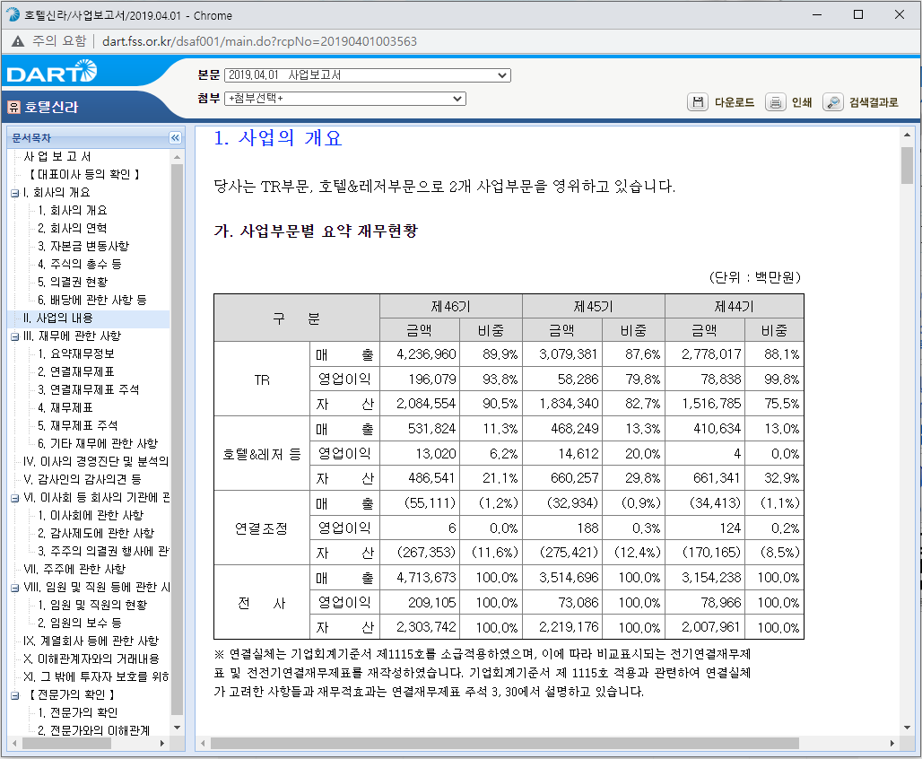 쉽게 말씀 드리기 위해서 호텔신라의 2018년 사업보고서 (18년도 전체 사업에 대한 연간보고서)를 예시로 말씀 드리겠습니다.