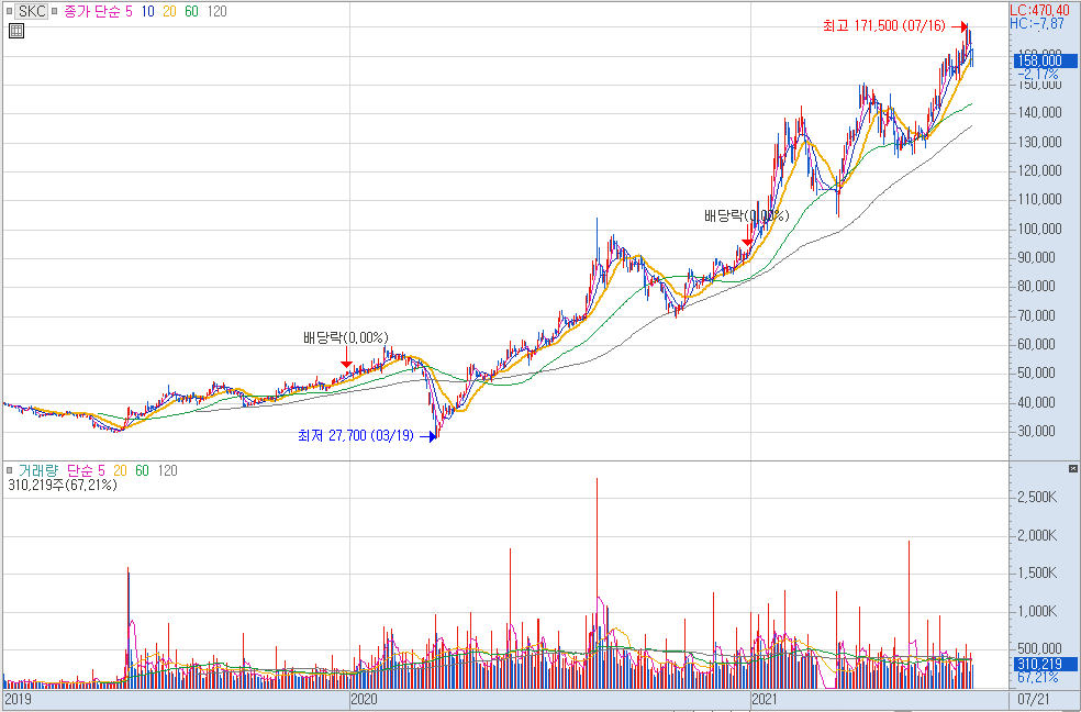 하지만, 현재 주가에서 SKC의 주식을 매수하시는 것은 제 입장에서는 조심스럽긴 합니다..