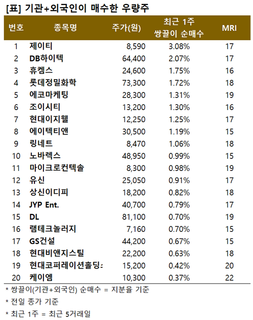- 21년 7월 3주의 기관 및 외국인이 매수한 우량주에 제이티가 포함되어 있음