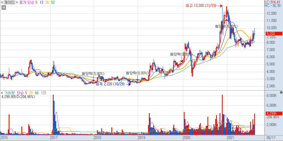 - 제이티의 올해 예상 매출액은 전년 대비 29.5% 늘어난 578억원, 영업이익은 61.3% 증가한 86억원으로 상향되었음. (21년 8월 17일, IBK 투자증권)