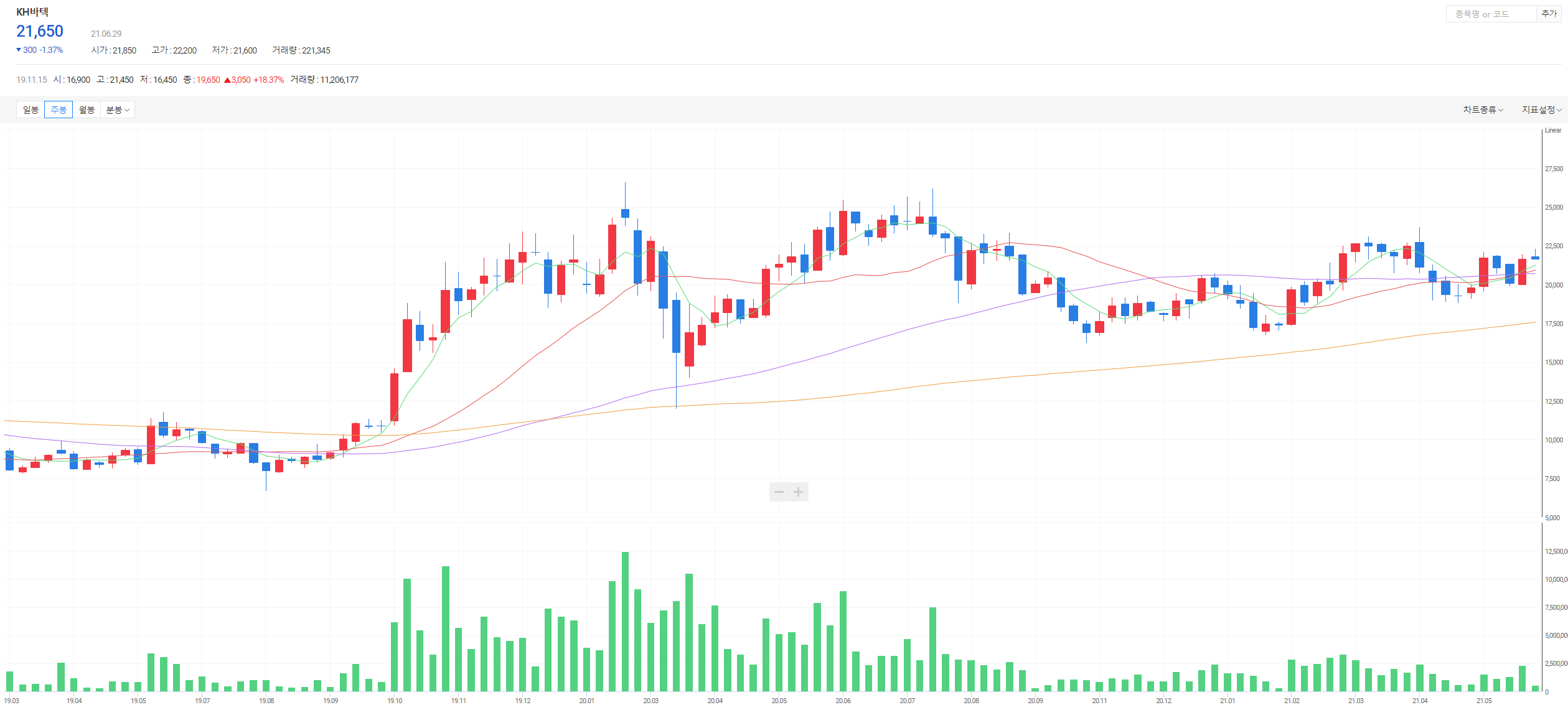 KH바텍의 주가를 보시면 갤럭시폴드1이 출시된 19년 9월에 주가가 크게 상승하고 그 이후로는 15,000원 에서 25,000원의 넓은 간격으로 움직이고 있는 것을 아실 수 있습니다.