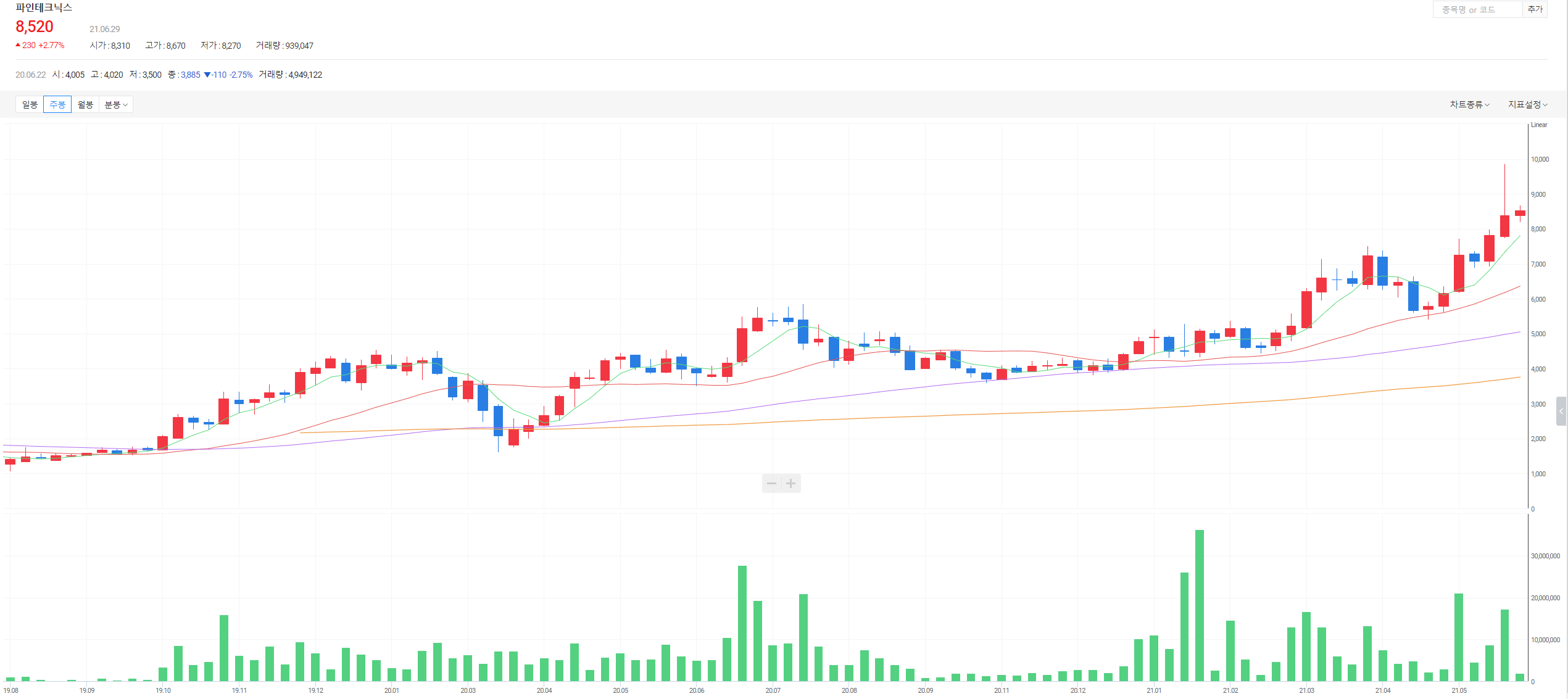 파인테크닉스의 주가를 보시면 갤럭시폴드1이 출시된 19년 9월에 주가가 크게 상승하고 코시국을 제외한다면 약 1년간 횡보를 하다가 크게 상승추세를 보이고 있습니다.